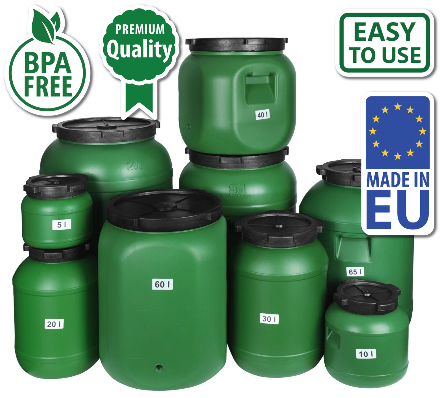 Die Fässer bestehen aus HDPE-Kunststoff (hochdichtem Polyethylen) – einem der sichersten und am häufigsten verwendeten Materialien für Lebensmittelverpackungen. Es ist beständig gegen Säuren, Fette und Temperaturschwankungen.