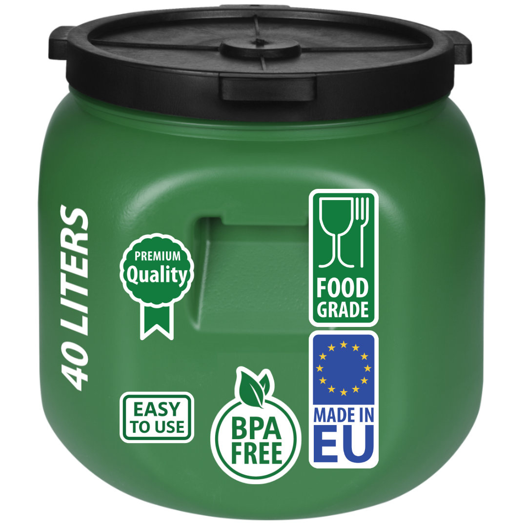 Das Polyethylen, aus dem unser Fass besteht, interagiert nicht mit Lebensmitteln. Dies garantiert, dass der Geschmack Ihrer sorgfältig zubereiteten Silage nicht beeinträchtigt wird. Zusätzlich ist das Fass aus dickerem Material gefertigt als Standardfässer, sodass nichts entweichen kann. Die große Öffnung bietet besten Bedienkomfort, und die praktischen Griffe an den Seiten erleichtern den Transport.